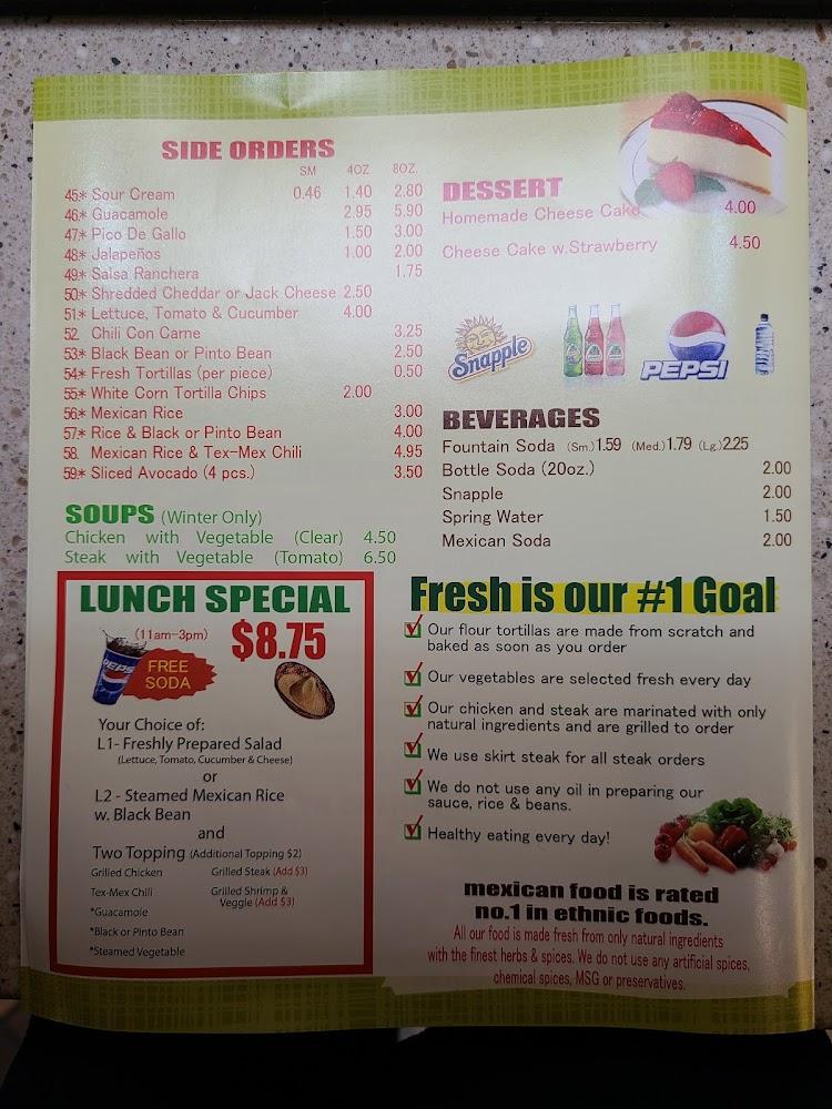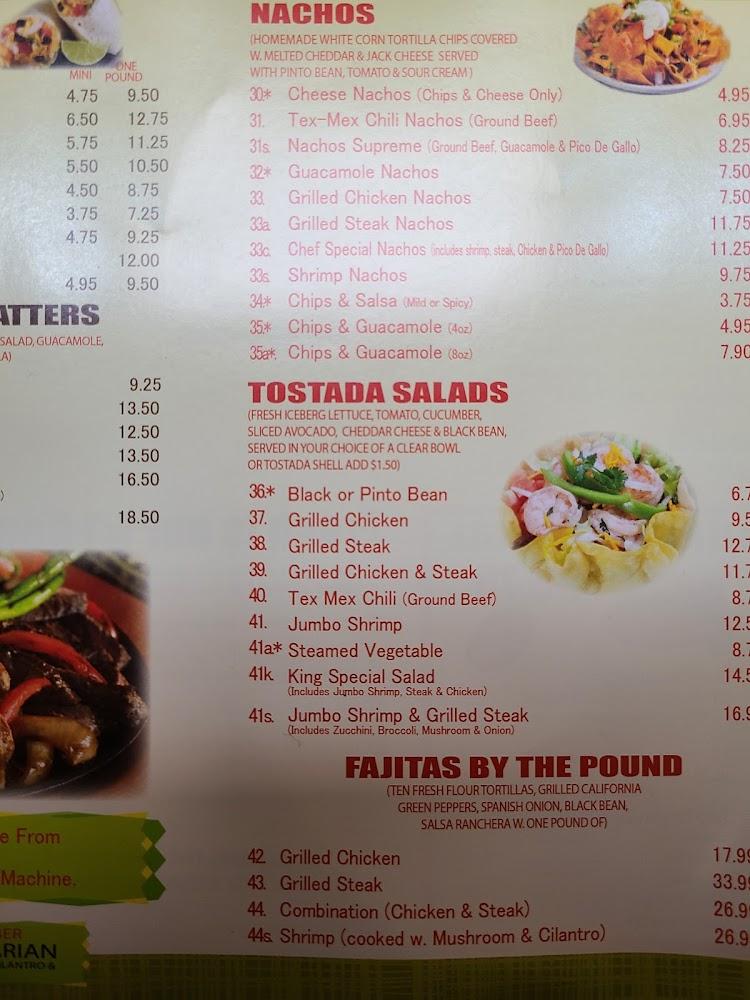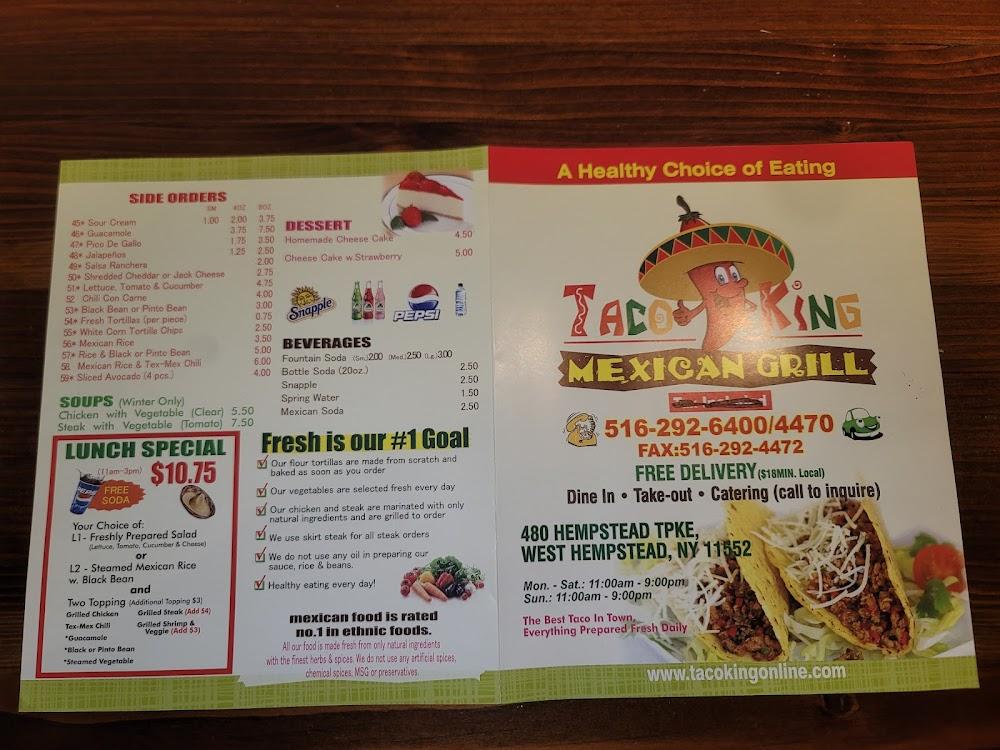 Beverages offer a taste of Mexico, featuring classic sodas and refreshing water. Desserts like homemade cheesecake cap off the meal nicely. Overall, Taco King's menu combines traditional and contemporary flavors to create an expansive and delicious dining experience.