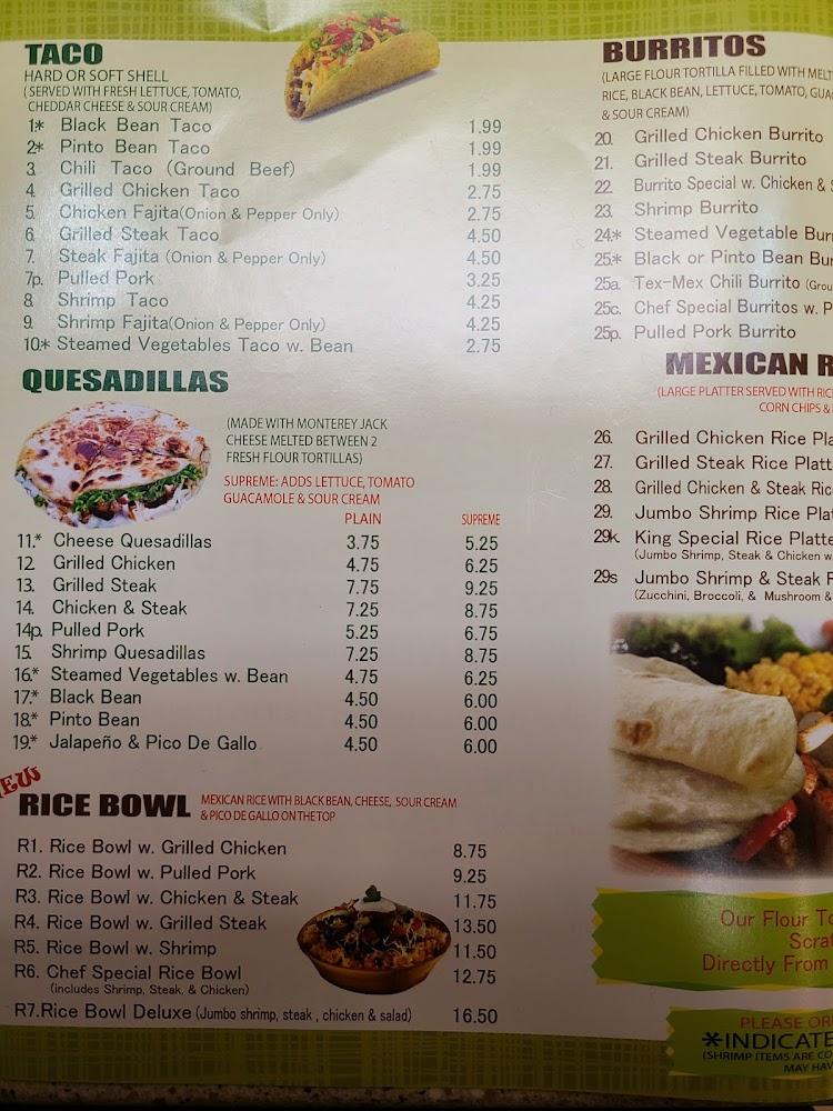 The menu at Taco King offers a diverse selection of Mexican delights. It includes tacos, burritos, fajitas, and quesadillas, catering to various tastes. Must-try dishes include the Grilled Skirt Steak and Chicken Burritos. A standout is their Quesadilla, which impresses with generous fillings.